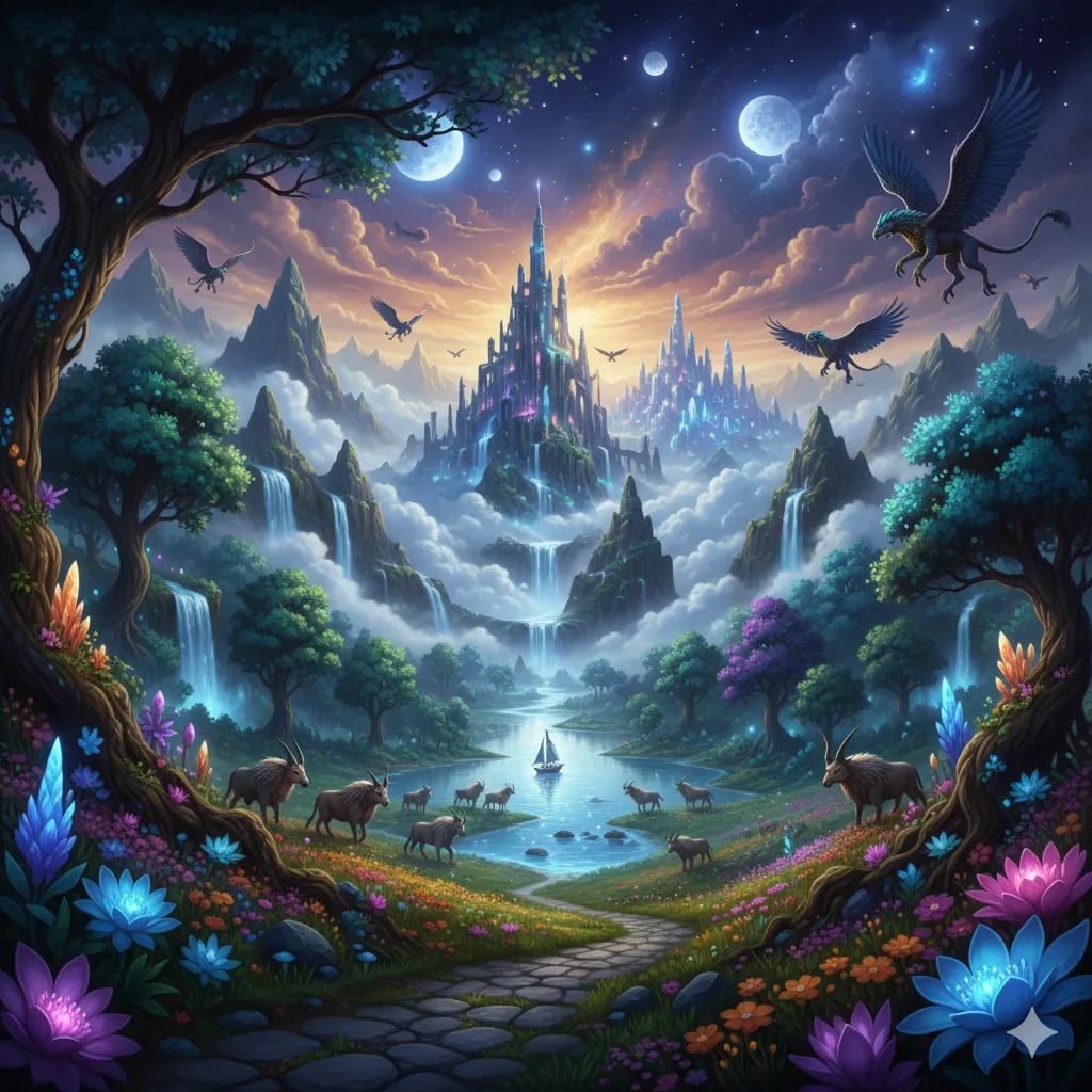 Et episk landskab skabt til en fantasy-roman. Kombinerer realistiske elementer med magiske detaljer.