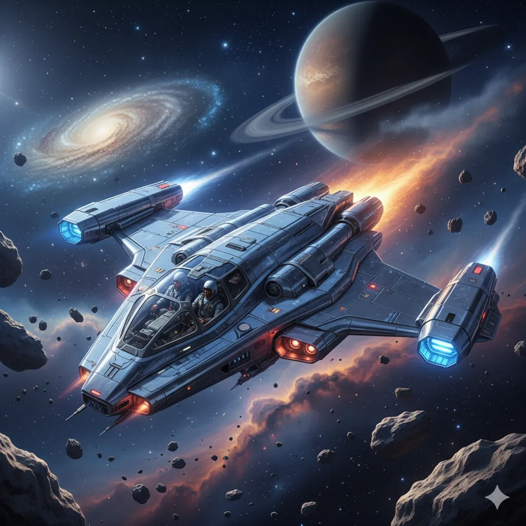 Detaljeret design af et rumfartøj til et sci-fi projekt. Tekniske tegninger og visuelle referencer.